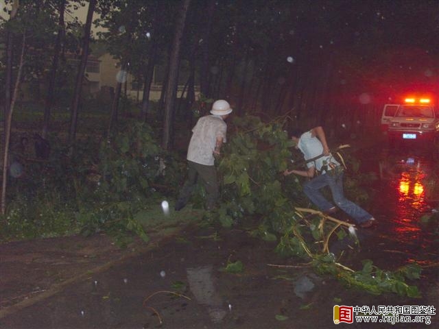 6月5日下午15:00时左右,沭阳境内气象异常,狂风大作,沭阳公路站立即启动公路交通突发事件蓝色Ⅳ级预警状态,担负公路抢通职责的路政大队各巡查中队迅速赶赴各责任辖区,监控恶劣气候对公路交通环境造成的影响,发现险情及时按《公路交通突发事件应急预案》要求实施应急响应行动。 15:40,S326线沂涛、马厂境内狂风肆虐的同时,突遭冰雹袭击,时间长达十余分钟,公路沿线大量树木折断、倒伏,先后有8株行道树横向倒伏至路面方向,阻塞正常行车通道,正在该路段巡查的路政大队二中队执法人员立即下车冒着1-2.5厘米直径大小的冰雹砸击,徒手将倒伏在路面上的树干拖移至路边,并通知马厂养护工区增派养护人员立即上路清除断枝残树,及时恢复道路行车环境的安全畅通。在同一时间,虽未受冰雹袭击的G205线道路两侧行道树也被横扫而过的狂风折断倒伏向路面十余株,已经守候在线路上的路政巡查人员和胡集、庙头养护工区人员立即动手在第一时间快速清理阻塞现场。至16:30,沭阳境内国省干线公路遭遇气象灾害形成的道路安全隐患已全部消除,恢复了正常畅通。 中华人民共和国图鉴社