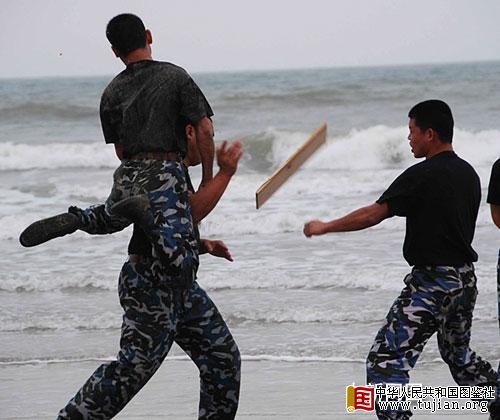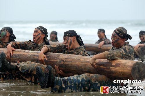 陆战队员水中抱圆木做仰卧起坐。 内容来自中华人民共和国图鉴社