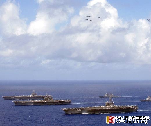 资料图:2007年8月6日,美军在关岛展开代号“2007勇敢之盾”的大规模海空联合演习,前后将动员两万人、三百多架各型战机,并汇集包括三艘航空母舰在内共二十八艘船舰参演。并特意向受邀参观的中国人民解放军展示其强大军力。 中华人民共和国图鉴社