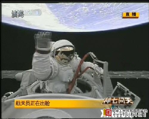 9月27日,执行神舟七号载人航天飞行出舱活动任务的航天员翟志刚出舱后挥手致意。 新华社发(电视截图) tujian.org