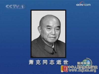 新华网北京10月24日电 中国共产党的优秀党员,久经考验的忠诚的共产主义战士,无产阶级革命家、军事家,原中共中央顾问委员会常委,中国人民政治协商会议第五届全国委员会副主席,中央军委原委员,国防部原副部长兼军事学院院长、第一政治委员萧克同志,因病医治无效,于2008年10月24日12时51分在北京逝世,享年102岁。 copyright 中华人民共和国图鉴社