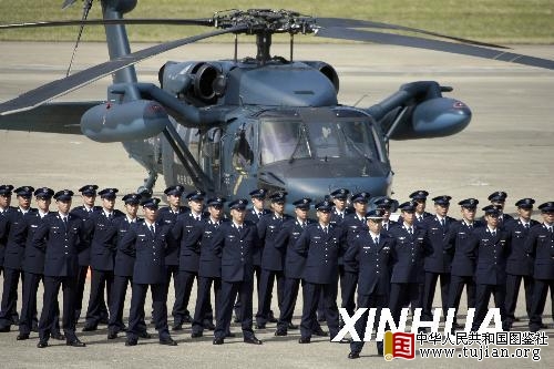 10月19日,日本自卫队官兵及直升机在航空自卫队位于茨城县的百里基地接受检阅。当天,日本陆、海、航空自卫队在百里基地举行三年一度的航空阅兵式,包括F-15、F-2等机型在内的82架飞机及约5000名官兵参加了此次阅兵式,日本首相麻生太郎参加检阅并发表讲话。新华社记者任正来摄 copyright 中华人民共和国图鉴社