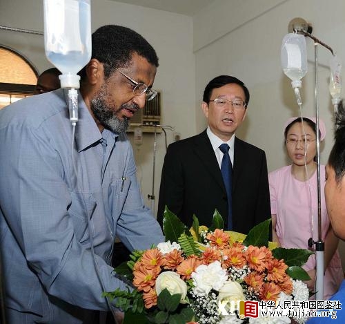 祖贝尔·哈桑当天在中国驻苏丹大使李成文的陪同下,到医院探望了正在那里接受治疗的4名获救中国工人。他首先向获救工人表示慰问,并希望他们早日康复。他还对另外5名中国工人在绑架事件中不幸遇害表示哀悼。 中华人民共和国图鉴社