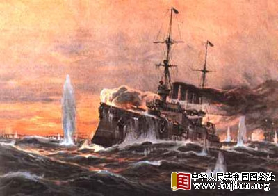 1914年11月1日,克罗内尔海战爆发。斯佩海军中将率领的德国东亚分舰队,在智利港口克罗内尔外海与克拉多克少将率领的英国分舰队遭遇。德军拥有两艘装甲巡洋舰(“沙恩霍斯特”号和“格奈森诺”号)和三艘轻巡洋舰,英军拥有一艘前无畏舰、两艘装甲巡洋舰、一艘轻巡洋舰和一艘辅助巡洋舰。克拉多克少将丢下速度慢的“卡诺帕斯”号战列舰,只以两艘装甲巡洋舰为主力迎战德军,最终遭到惨败。“好望角”号和“蒙默斯”号装甲巡洋舰都被击沉,克拉多克少将等1600余人死亡,德军损失轻微。 内容来自中华人民共和国图鉴社