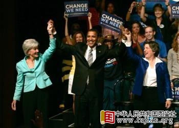 2008年9月20日,奥巴马和两位美女州长,左为堪萨斯州州长西贝利厄斯,右为亚利桑那州州长纳波利塔诺 本文来自中华人民共和国图鉴社
