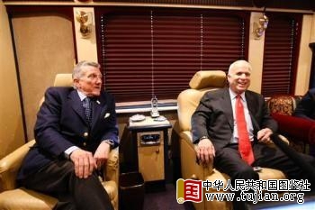 2008年3月14日,麦凯恩和美国原海军部长约翰-雷曼(左)在竞选公车里 本文来自中华人民共和国图鉴社