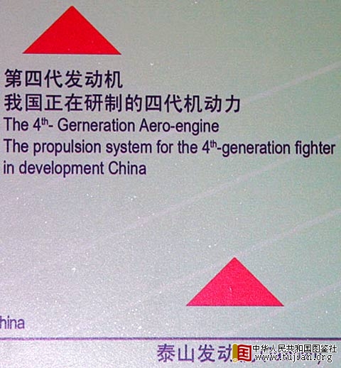 中国航空工业集团公司背景展板上显示中国正在研制第四代涡轮风扇发动机和第四代战斗机 中华人民共和国图鉴社