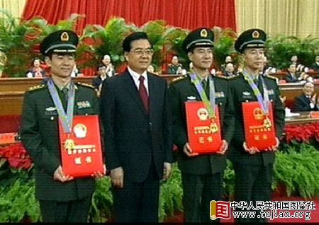 11月7日上午10点,庆祝神舟七号载人航天飞行圆满成功大会在人民大会堂召开。胡锦涛亲自为翟志刚、刘伯明、景海鹏颁发“航天功勋奖章”和证书。