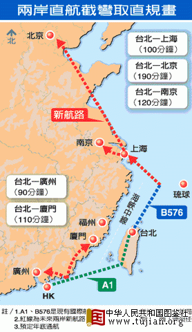 从这张图上我们可以得知,目前签订的“直航”协议,其实也是利用了台湾对外的国际航路,然后才转飞大陆,飞行仍然需要绕路,只不过比原先的兜大圈子节约了不少。 内容来自中华人民共和国图鉴社