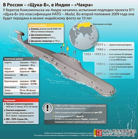 俄网站上刊出的租借给印度的阿库拉级核潜艇示意图,计划租价6.5亿美元,租期5年 中华人民共和国图鉴社
