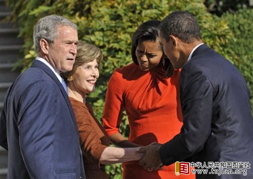 布什表现得热情好客,虽然在美国总统选举过程中他被民主党的奥巴马当成攻击其所在的共和党候选人的反面教材,但是布什夫妇还是铺好了红地毯,让奥巴马夫妇踏足。这似乎也在寓意着一个美好的愿望——在奥巴马的任期内,美国人能摆脱经济危机,重新过上红火的日子。 中华人民共和国图鉴社