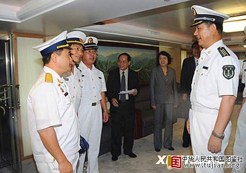 11月18日,中国海军“郑和号”训练舰出访指挥员、大连舰艇学院院长杨骏飞(右)在“郑和号”上会见越南军政代表 内容来自中华人民共和国图鉴社