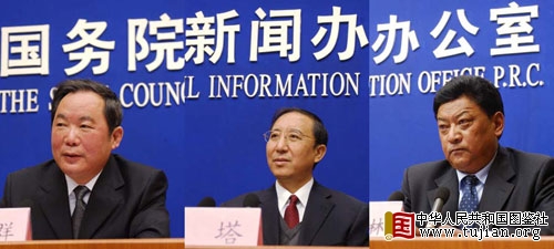此次参加与达赖私人代表商谈的中央政府三大高官,悉数亮相国务院新闻办记者会。从左到右依次为中央统战部常务副部长朱维群、中央统战部副部长斯塔、西藏自治区副主席白玛赤林。(国务院新闻办网站) 中华人民共和国图鉴社