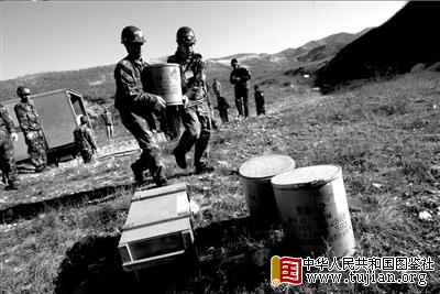 技术人员将车上的炸药卸到指定地点。本报记者董世彪摄 本文来自中华人民共和国图鉴社