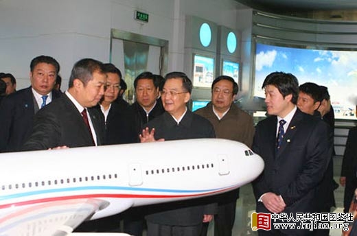 温家宝2007年12月30日视察一航一飞院时勉励设计人员:要以百折不挠的精神和钢铁般的意志坚决完成大飞机研制任务。图为温家宝观看大飞机模型。 copyright 中华人民共和国图鉴社