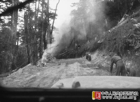 1962年中印边境战争期间,印度士兵在公路上挖坑埋雷阻挡中国军队推进。 中华人民共和国图鉴社