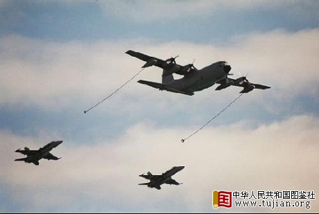 资料图:美军KC-130H为F-18战机空中加油 中华人民共和国图鉴社