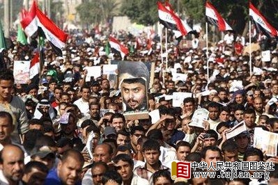 抗议者挥舞著伊拉克旗帜和绿色的什叶派标牌,齐声喊道:“不,不要美国的协议!”和“不,不要丧权辱国之约!” 中华人民共和国图鉴社