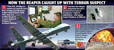 据英国媒体11月25日报道,美国军队22日曾对巴基斯坦西北部落地区发动导弹袭击,并使得包括英籍恐怖头目拉希德-拉乌夫在内的至少5名恐怖分子死亡。美军最新披露的消息显示,驻阿美军当天是在得到准确的地面情报后,远程遥控一架正在附近巡逻的无人机前往发动袭击的。 中华人民共和国图鉴社