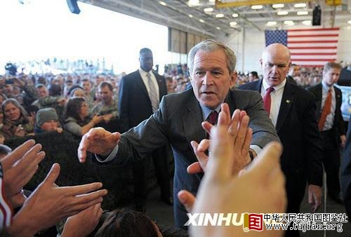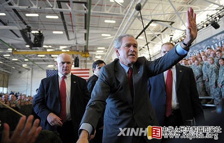 11月25日,美国总统布什在肯塔基州坎贝尔堡向官兵打招呼。