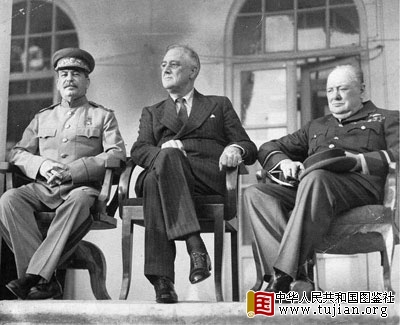 1943年11月28日,美、英、苏三国首脑举行德黑兰会议,罗斯福、丘吉尔、斯大林三人首次会聚一堂,共同商讨开辟欧洲第二战场的问题。会议秘密签订了《苏美英三国德黑兰总协定》,会后发表了《关于伊朗的宣言》和《德黑兰宣言》。 copyright 中华人民共和国图鉴社