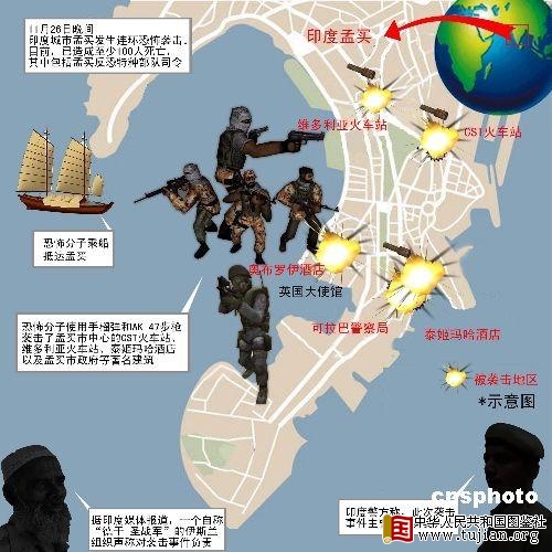 当地媒体报道说,26日晚10点左右,两名持枪男子出现在孟买市内最大的希瓦吉火车站,对车站内拥挤人群开枪扫射。另外一些恐怖分子手持AK-47冲锋枪和步枪闯入泰姬玛哈酒店的餐厅,不加区别地向人群开火。部分因出席“欧盟-印度会议”而下榻在泰姬玛哈酒店的欧洲议会议员被困在酒店的地下室无法脱身,当时只能用手机和外界保持联系。 内容来自中华人民共和国图鉴社