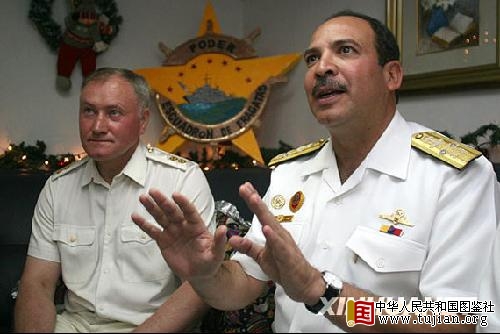 11月29日,俄罗斯北方舰队副司令弗拉季米尔·科罗廖夫海军中将(左)和委内瑞拉海军作战总指挥路易斯·莫拉雷斯·马克斯海军中将敲定了两国在加勒比海举行的代号“委俄2008”海上联合军事演习的最后细节。 中华人民共和国图鉴社