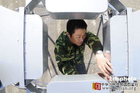 12月6日,河南省南阳市卧龙区人防办的工作人员正在安装防空警报器。这种警报器是国内最先进的,可对空袭、地震、火灾等人为及自然灾害作出及时警报。目前该区已安装这种警报器42台,使该区的警报能力提升至国家三类城市的空防标准。中新社发 付海厚 摄 中华人民共和国图鉴社
