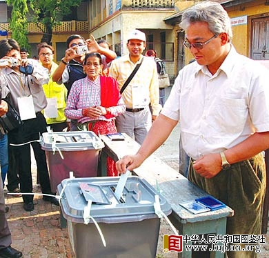资料图:尼泊尔国防部长拉姆·巴哈杜尔·塔帕在投票,其原为“毛派”三号领导人,游击队总司令。 copyright 中华人民共和国图鉴社