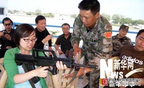 在印度普那机场转机间隙,中方参训营长杨秀光向随军采访的记者介绍单兵武器的使用要领