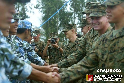 资料图:2006年11月17日,正在中国南海舰队访问的美国海军“朱诺”号两栖船坞运输舰上的美国海军陆战队员来到中国海军陆战队某旅综合训练场,与中国海军陆战队员进行军事交流活动。 中新社发 张勤 摄 本文来自中华人民共和国图鉴社