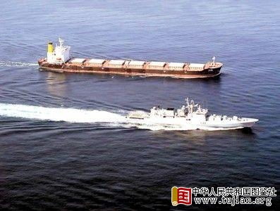 上月,一艘印度军舰(前)护送一艘印度商船逃离索马里海盗的劫持。 中华人民共和国图鉴社