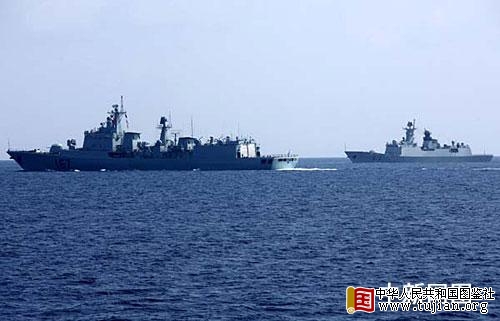 中国海军第二批护航编队两艘战舰"深圳"号导弹驱逐舰和"黄山"号导弹护卫舰,4月13日抵达亚丁湾任务海域与首批护航编队会师。中新社记者 孙自法 摄 中华人民共和国图鉴社
