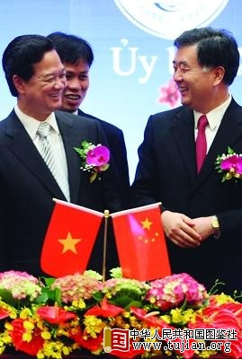 19日,访问广东的阮晋勇(左)称要和中国扩大经贸合作。 中华人民共和国图鉴社