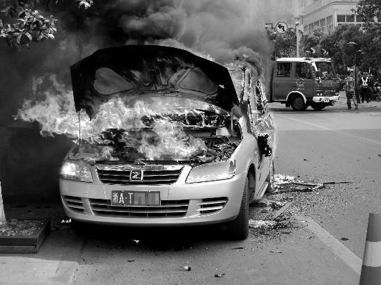 “当时我正好坐在收银台这个位置,正对着玻璃大门,车子就停在门口的路边。一个男司机从冒烟的出租车[ChuZuChe]上下来,车子还噼里啪啦地响着。紧接着,车就开始烧起来了,烧得那个火光冲天哟。大概也就8分钟吧,我记得看了一下表的,那辆车就剩下一个空壳了。火苗蹿得比旁边的树还高,你看树叶都烧着了。我们店的一辆自行车和一辆新买的电动[DianDong]车也烧到了,我哪里敢去拿进来……我关好了门,在里面打了报警电话。大家也都隔得远远地看,就怕它爆炸了。”边上花店的罗大妈事后说起来,还很后怕,“还好,当时这条路上没什么车经过。” 织梦好,好织梦