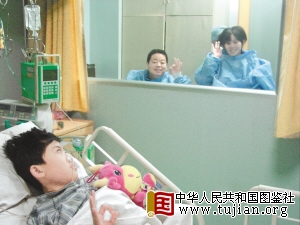 图为术后父母在病房窗外探望、鼓励杉杉。